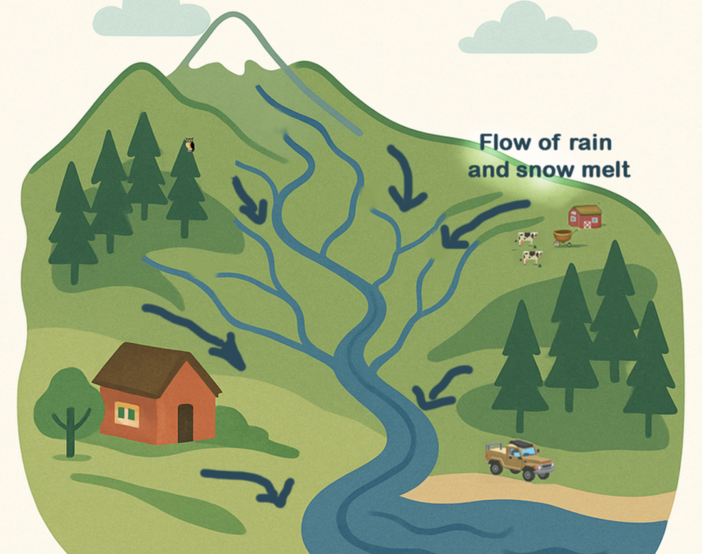 Watershed. The total area above a watercourse — such as a stream — that contributes water to its flow. A mountain face, for example, may be within the watershed of a creek, since water runs down the mountain into the creek. Anything happening in the watershed can have downstream consequences.