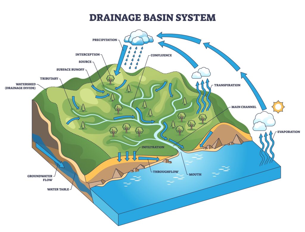 Watershed. The total area above a watercourse — such as a stream — that contributes water to its flow. A mountain face, for example, may be within the watershed of a creek, since water runs down the mountain into the creek. Anything happening in the watershed can have downstream consequences. Watersheds direct rain and snow into lower bodies of water:
